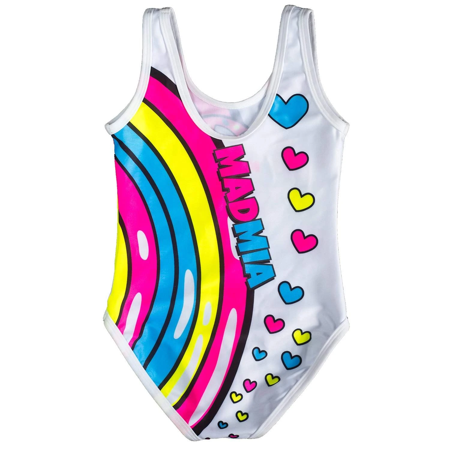 MADMIA Unicorn Leotard is a white leotard with a unicorn print, complete with rainbows and stars.