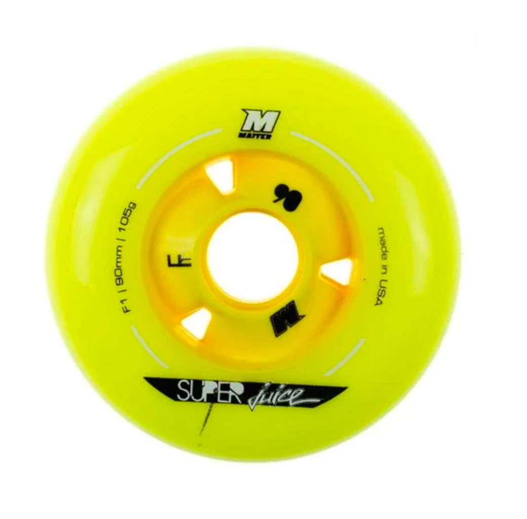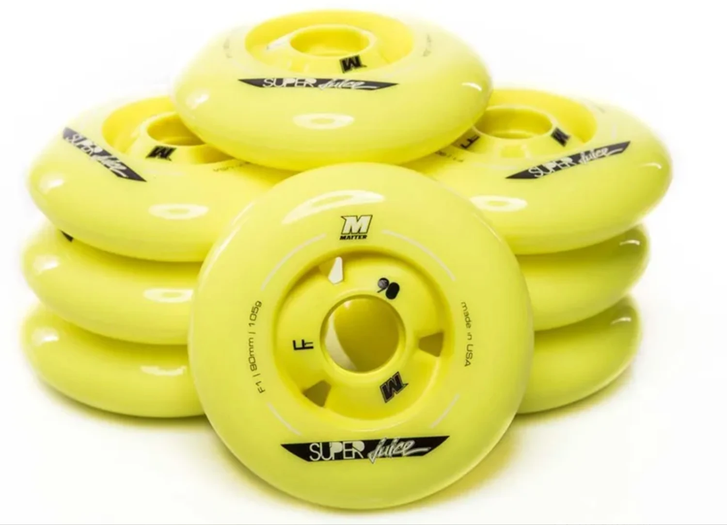 Matters original high performance racing wheel, the Super Juice. The Super Juice wheels were the first ever Matter wheels to use Hollow Core Technology. This core has been fundamental to Matter?s success over the years. The Hollow Core allows for a very stiff core, without the added weight of a traditional single piece core. The Super Juice wheel is perfect for road and marathon events because of its fast rolling performance. This wheel comes in 90mm and F1 / 86A.